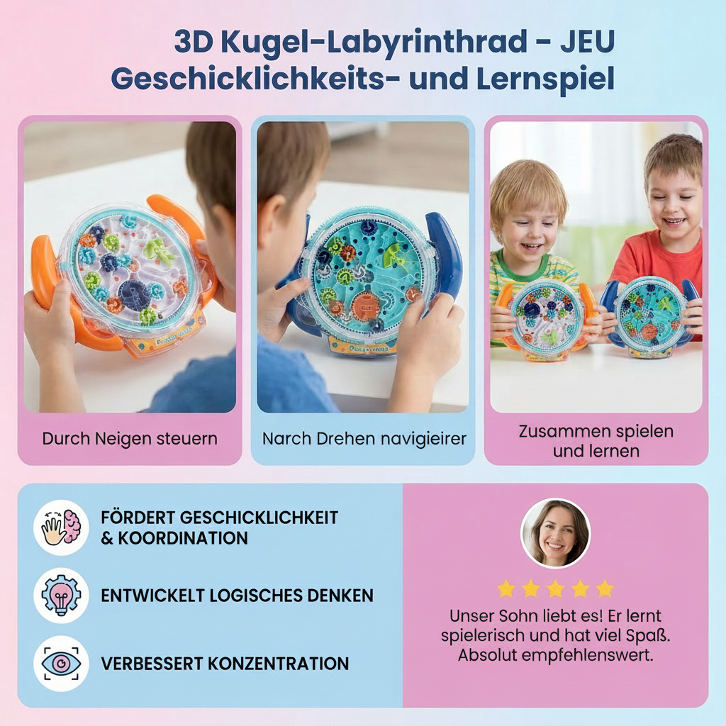 Erlebe, wie Spaß, Lernen und Geschicklichkeit in einem einzigartigen Erlebnis verschmelzen. Das 3D Kugel-Labyrinthrad ist mehr als ein Spielzeug – es ist dein Begleiter auf dem Weg zu mehr Konzentration, Kreativität und mentaler Balance.